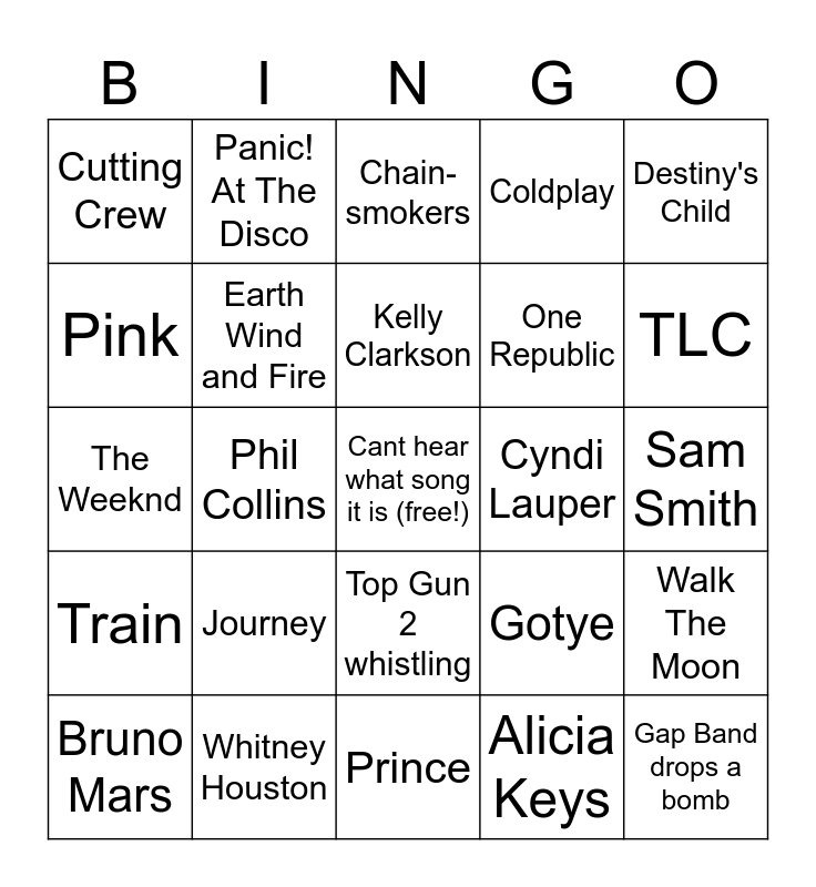 This bingo card has a free space and 29 words: Bruno Mars, Dua Lipa, Phil Collins, Lewis Capaldi, Cutting Crew, Chain-smokers, Earth Wind and Fire, Journey, Cyndi Lauper, Whitney Houston, Sam Smith, Gap Band drops a bomb, Prince, Alicia Keys, TLC, Huey Lewis and the News, Top Gun 2 whistling, Train, Destiny's Child, The Weeknd, Gotye, Ed Sheeran, One Republic, Pink, Coldplay, Panic! At The Disco, Walk The Moon, Kelly Clarkson and Mr Mister.