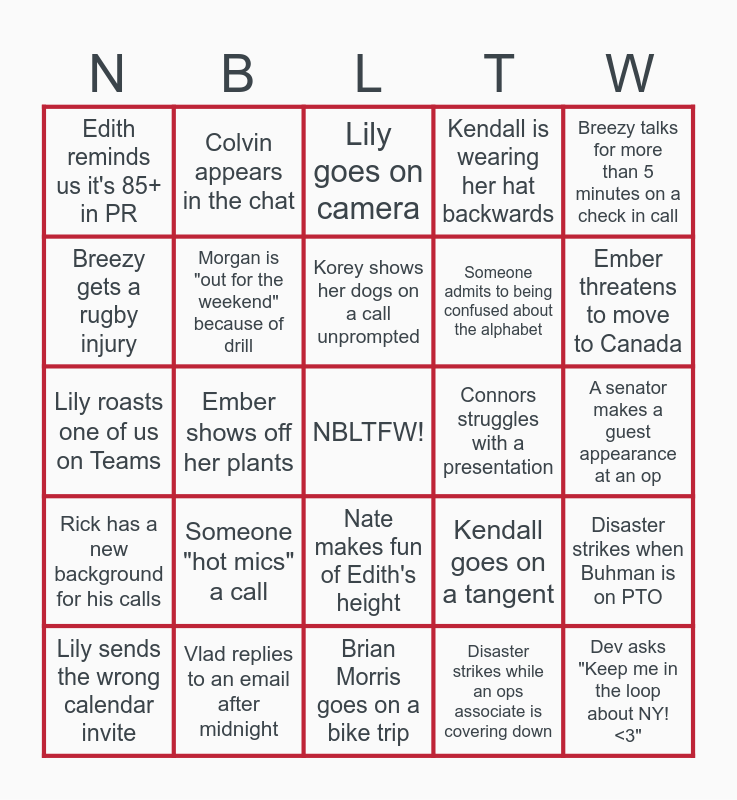 This bingo card has a free space and 41 words: A volunteer leader "Replies All" to a branch email, Lily roasts one of us on Teams, Your trailer deployed this year, Morgan is "out for the weekend" because of drill, Vlad replies to an email after midnight, Nate makes fun of Edith's height, Korey shows her dogs on a call unprompted, Kira mentions a sporting event, Breezy talks for more than 5 minutes on a check in call, Rick has a new background for his calls, Ember shows off her plants, Kendall is wearing her hat backwards, Dev asks "Keep me in the loop about NY! <3", A senator makes a guest appearance at an op, Connors struggles with a presentation, Someone "hot mics" a call, Megan scores free sporting tickets, Edith reminds us it's 85+ in PR, Mike "hearts" a message, Lily goes on camera, Disaster strikes when Buhman is on PTO, The rental vehicle process changes (again), Brian Morris goes on a bike trip, Someone admits to being confused about the alphabet, Maggi comes back to the NB, Someone begins the call 6 minutes early, Disaster strikes while an ops associate is covering down, Mike gives a deadline of the 15th, Ember threatens to move to Canada, Nate's background is flipped backwards, Buhman provides metrics on a call, Colvin appears in the chat, Lily sends the wrong calendar invite, Connors posts a gif in the chat, Kendall goes on a tangent, Breezy gets a rugby injury, Chris sends a baby picture, Gorham makes a guest appearance, Vlad checks in from a different country, FORD is brought up on a call and Rick sends out an invite, and forgets to add everyone.