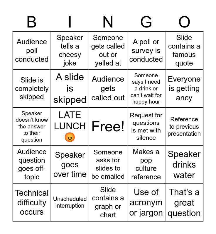 This bingo card has a free space and 24 words: Technical difficulty occurs, Speaker goes over time, Audience gets called out, Use of acronym or jargon, Slide contains a famous quote, Audience poll conducted, Speaker tells a cheesy joke, Someone gets called out or yelled at, Request for questions is met with silence, Reference to previous presentation, Speaker doesn’t know the answer to their question, A slide is skipped, Makes a pop culture reference, Speaker drinks water, Slide is completely skipped, Unscheduled interruption, Slide contains a graph or chart, A poll or survey is conducted, Everyone is getting ancy, Audience question goes off-topic, LATE LUNCH 😡, Someone asks for slides to be emailed, Someone says I need a drink or can’t wait for happy hour and That's a great question.