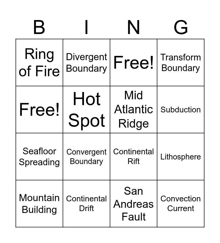 This bingo card has 16 words: Continental Drift, Lithosphere, Free!, Ring of Fire, Seafloor Spreading, Divergent Boundary, Continental Rift, San Andreas Fault, Free!, Hot Spot, Mountain Building, Transform Boundary, Convergent Boundary, Subduction, Mid Atlantic Ridge and Convection Current.