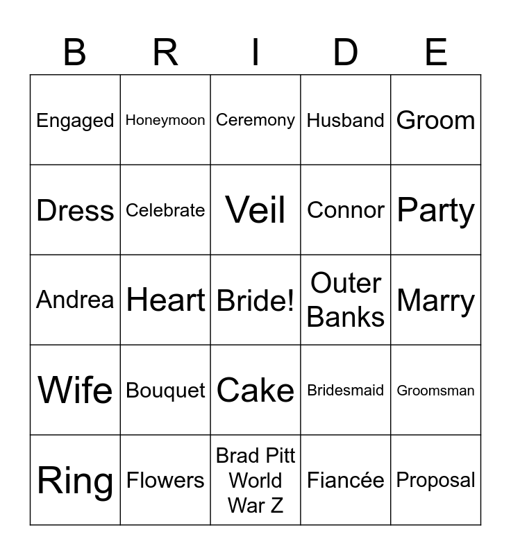 This bingo card has a free space and 24 words: Bouquet, Flowers, Veil, Ring, Groom, Engaged, Dress, Honeymoon, Outer Banks, Cake, Connor, Andrea, Bridesmaid, Groomsman, Celebrate, Fiancée, Marry, Ceremony, Party, Heart, Proposal, Wife, Husband and Brad Pitt World War Z.
