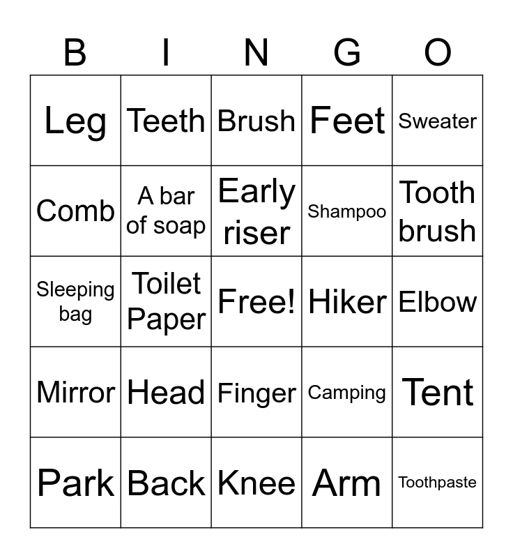 This bingo card has a free space and 24 words: Head, Back, Early riser, Park, Sweater, Leg, Comb, Teeth, Hiker, Finger, Shampoo, Sleeping bag, Camping, Tent, A bar of soap, Arm, Elbow, Brush, Tooth brush, Toilet Paper, Toothpaste, Mirror, Feet and Knee.