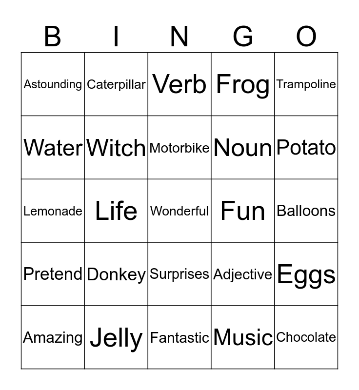 This bingo card has 25 words: Donkey, Fantastic, Motorbike, Amazing, Trampoline, Astounding, Water, Caterpillar, Fun, Surprises, Noun, Lemonade, Adjective, Eggs, Witch, Chocolate, Balloons, Verb, Potato, Life, Wonderful, Jelly, Pretend, Frog and Music.