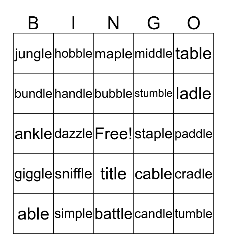 This bingo card has a free space and 24 words: sniffle, simple, bubble, able, table, jungle, bundle, hobble, staple, title, stumble, ankle, cable, cradle, handle, candle, paddle, maple, ladle, dazzle, tumble, giggle, middle and battle.