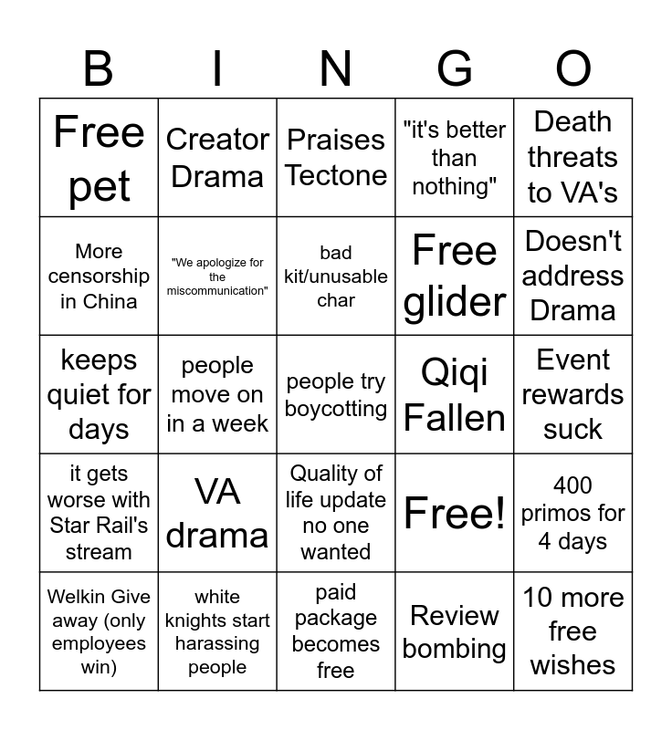 This bingo card has 25 words: VA drama, paid package becomes free, bad kit/unusable char, Welkin Give away (only employees win), Death threats to VA's, Free pet, More censorship in China, Creator Drama, Qiqi Fallen, Quality of life update no one wanted, Free glider, keeps quiet for days, Free!, 400 primos for 4 days, "We apologize for the miscommunication", 10 more free wishes, Event rewards suck, Praises Tectone, Doesn't address Drama, people move on in a week, people try boycotting, white knights start harassing people, it gets worse with Star Rail's stream, "it's better than nothing" and Review bombing.