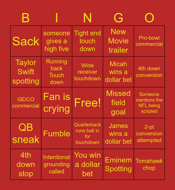 This bingo card has a free space and 27 words: James wins a dollar bet, Dani wins a dollar bet, Micah wins a dollar bet, You win a dollar bet, Taylor Swift spotting, Tight end touch down, someone gives a high five, QB sneak, Missed field goal, 2-pt conversion attempted, GEICO commercial, New Movie trailer, 4th down stop, Intentional grounding called, 4th down conversion, over 21 points scored, Running back Touch down, Wide receiver touchdown, Fumble, Sack, Someone mentions the NFL being scripted, Eminem Spotting, Fan is crying, Tomahawk chop, Quarterback runs ball in for touchdown, Pro-bowl commercial and Fireworks!.
