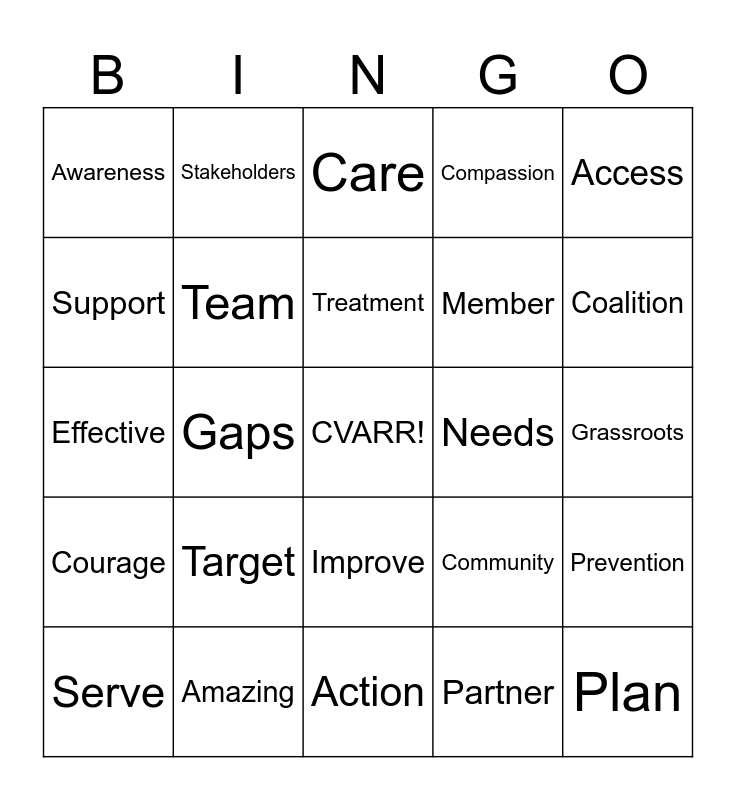This bingo card has a free space and 29 words: Serve, Positive, Gaps, Collaboration, Awareness, Care, Team, Target, Needs, Amazing, Grassroots, Plan, Action, Partner, Coalition, Leadership, Improve, Courage, Access, Effective, Community, Stigma, Member, Support, Compassion, Stakeholders, Prevention, Treatment and Recovery.
