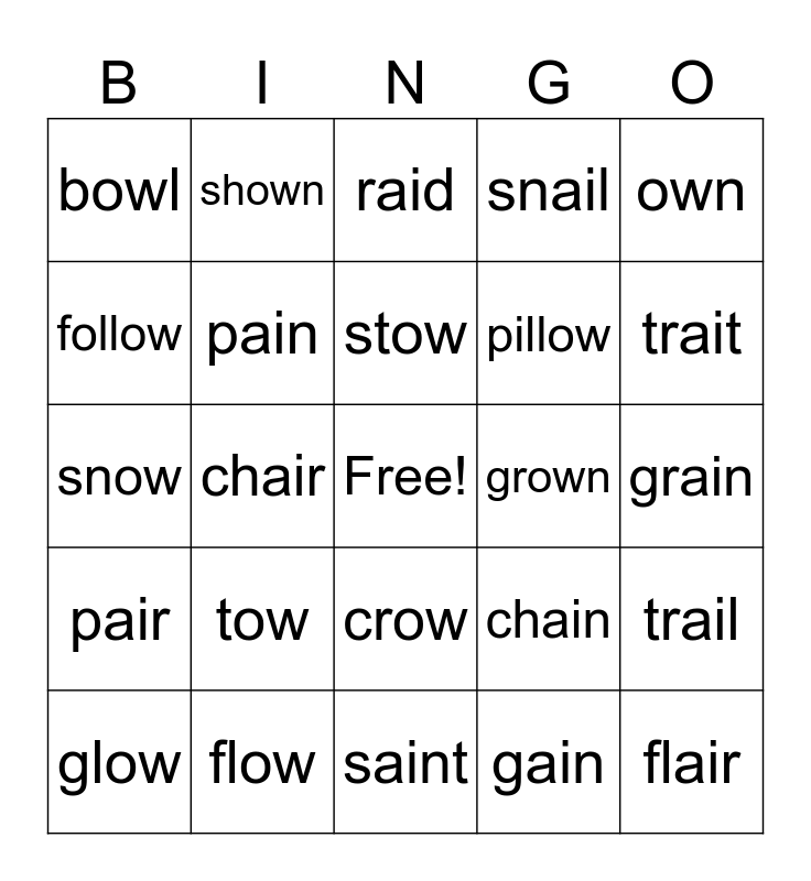 This bingo card has a free space and 24 words: tow, flow, stow, glow, own, bowl, follow, shown, grown, crow, pillow, snow, chain, trail, pain, gain, grain, raid, trait, chair, flair, pair, snail and saint.