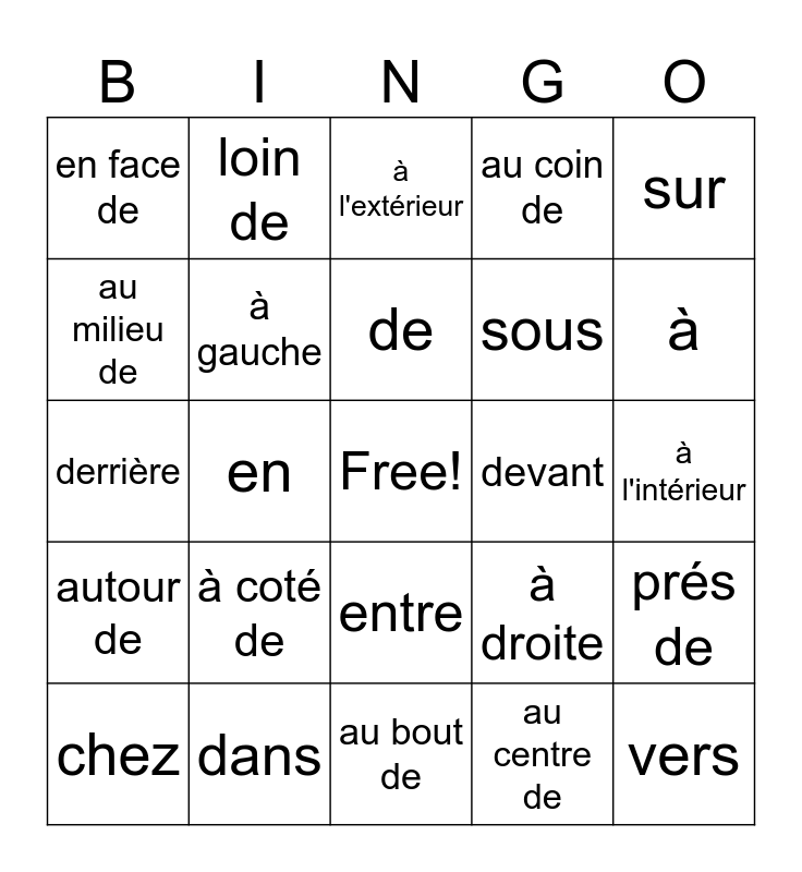 This bingo card has a free space and 24 words: à coté de, dans, de, chez, sur, en face de, au milieu de, loin de, devant, entre, sous, derrière, à droite, prés de, à gauche, au centre de, à l'intérieur, à l'extérieur, à, en, vers, autour de, au coin de and au bout de.