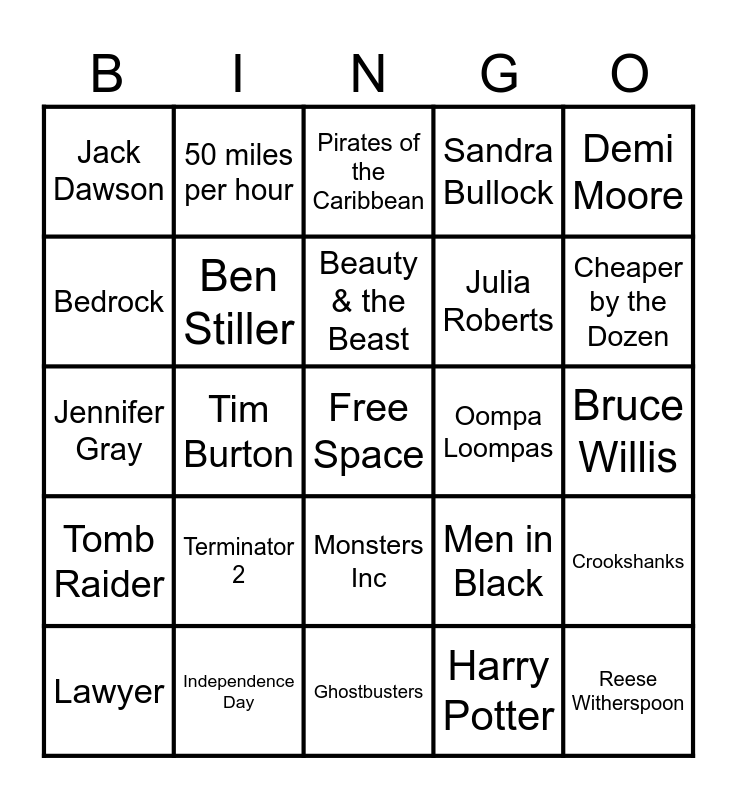 This bingo card has a free space and 24 words: Terminator 2, Independence Day, Beauty & the Beast, Lawyer, Demi Moore, Jack Dawson, Bedrock, 50 miles per hour, Oompa Loompas, Monsters Inc, Julia Roberts, Jennifer Gray, Men in Black, Crookshanks, Ben Stiller, Harry Potter, Bruce Willis, Pirates of the Caribbean, Cheaper by the Dozen, Tim Burton, Reese Witherspoon, Tomb Raider, Sandra Bullock and Ghostbusters.