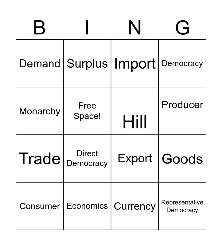 This bingo card has 16 words: Economics, Goods, Import, Demand, Trade, Surplus, Export, Currency, Monarchy, Free Space!, Consumer, Democracy, Direct Democracy, Producer, Hill and Representative Democracy.