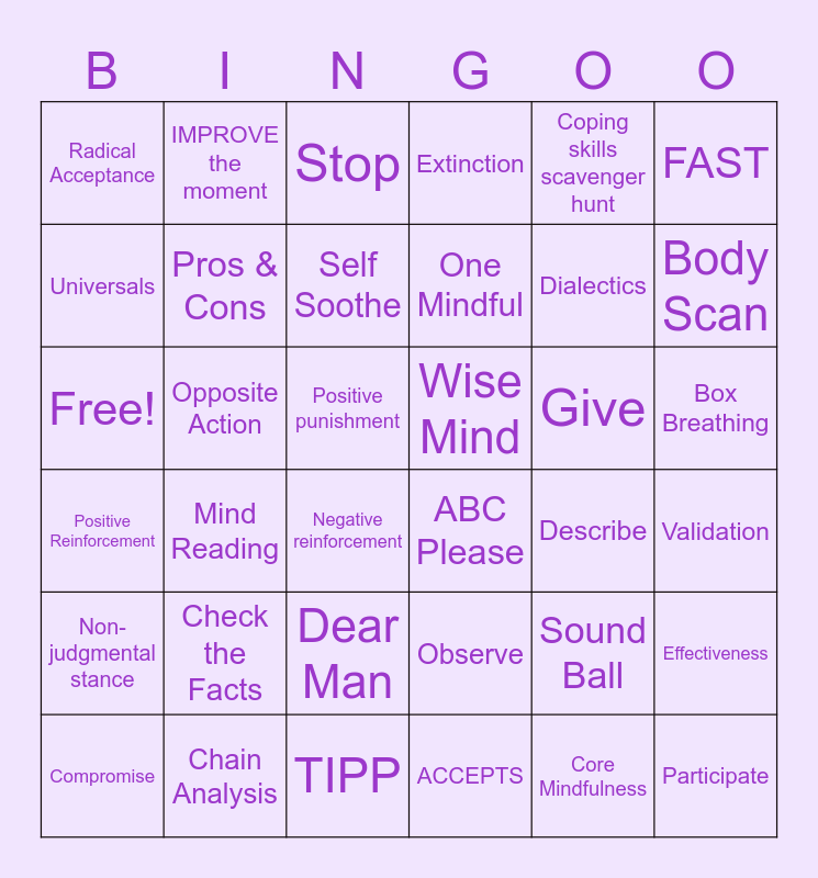 This bingo card has 36 words: Observe, Dear Man, ACCEPTS, Universals, Positive Reinforcement, Wise Mind, Pros & Cons, TIPP, Coping skills scavenger hunt, Sound Ball, Body Scan, Extinction, Effectiveness, Opposite Action, One Mindful, Radical Acceptance, Non-judgmental stance, Give, Free!, Stop, Positive punishment, Mind Reading, ABC Please, Negative reinforcement, Describe, IMPROVE the moment, Dialectics, Chain Analysis, Self Soothe, FAST, Participate, Compromise, Validation, Box Breathing, Check the Facts and Core Mindfulness.