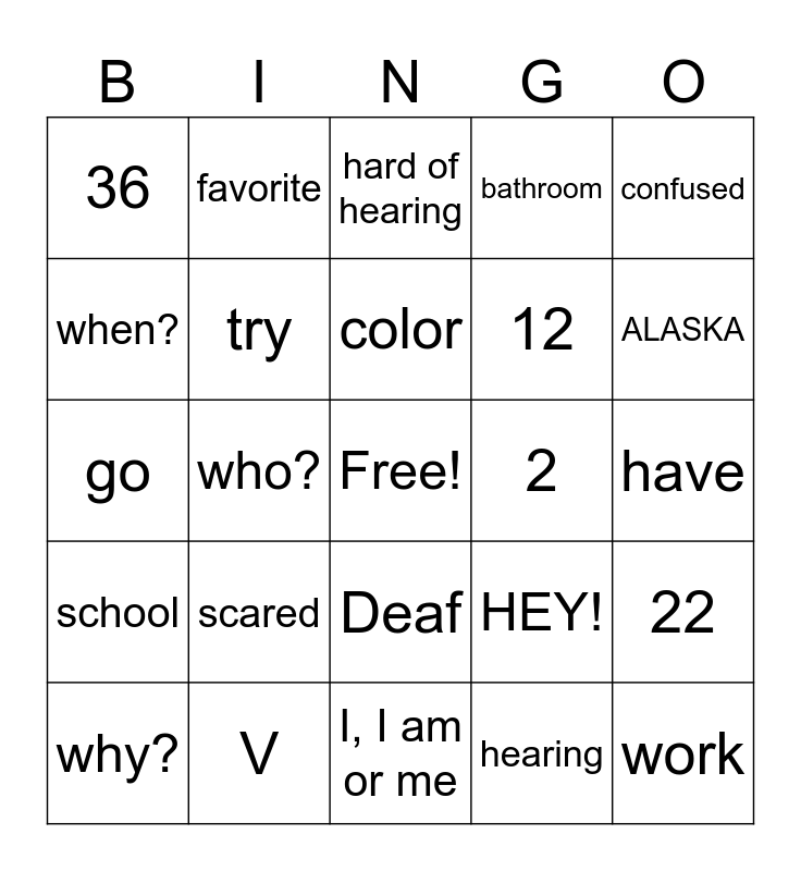 This bingo card has a free space and 24 words: scared, V, color, why?, confused, 36, when?, favorite, 2, Deaf, 12, go, HEY!, 22, try, hearing, have, hard of hearing, ALASKA, who?, work, school, bathroom and I, I am or me.