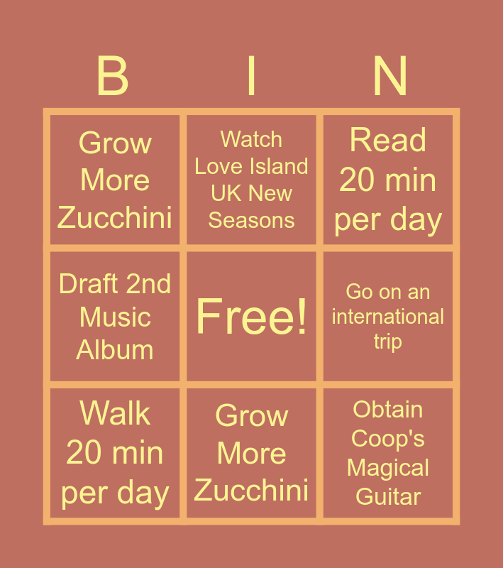 This bingo card has a free space and 9 words: Walk 20 min per day, Read 20 min per day, Watch Love Island UK New Seasons, Draft 2nd Music Album, Grow More Zucchini, Go on an international trip, Obtain Coop's Magical Guitar, Paddle Board X3 Weekends and Grow More Zucchini.