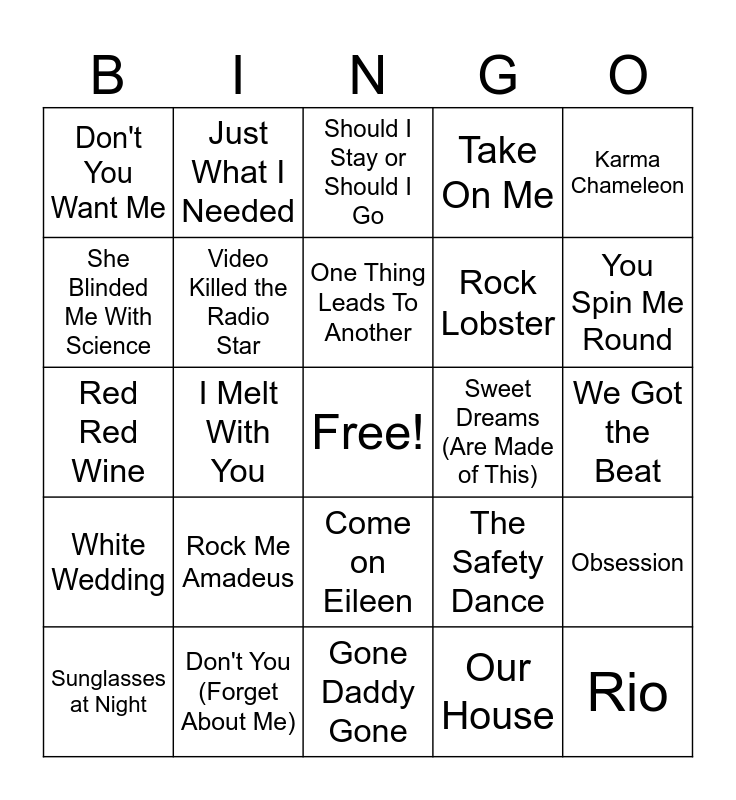 This bingo card has a free space and 40 words: Tainted Love, Red Red Wine, The Promise, Video Killed the Radio Star, Don't You (Forget About Me), Come on Eileen, One Thing Leads To Another, If You Leave, Karma Chameleon, White Wedding, I Melt With You, Take On Me, Rio, We Got the Beat, Sweet Dreams (Are Made of This), Rock Me Amadeus, I Ran (So Far Away), Don't You Want Me, Der Kommissar, Should I Stay or Should I Go, Obsession, Our House, Rock Lobster, She Blinded Me With Science, Whip It, Shout, People Are People, Cars, Down Under, I Want Candy, Dancing with Myself, Sunglasses at Night, Venus, The Safety Dance, You Spin Me Round, Gone Daddy Gone, Hold Me Now, Always Something There to Remind Me, Just What I Needed and Kids In America.