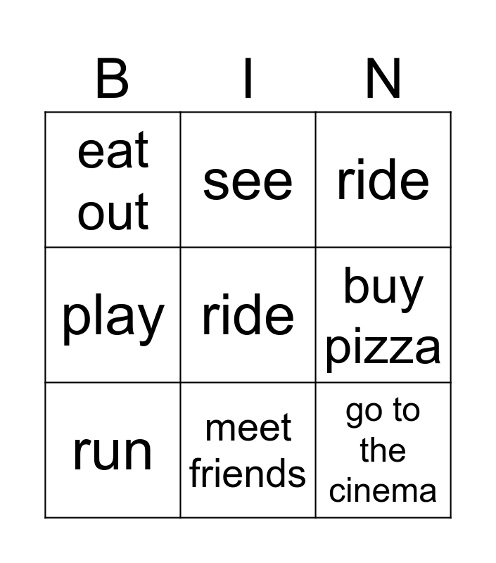 This bingo card has a free space and 8 words: buy pizza, ride, see, run, eat out, go to the cinema, play and meet friends.