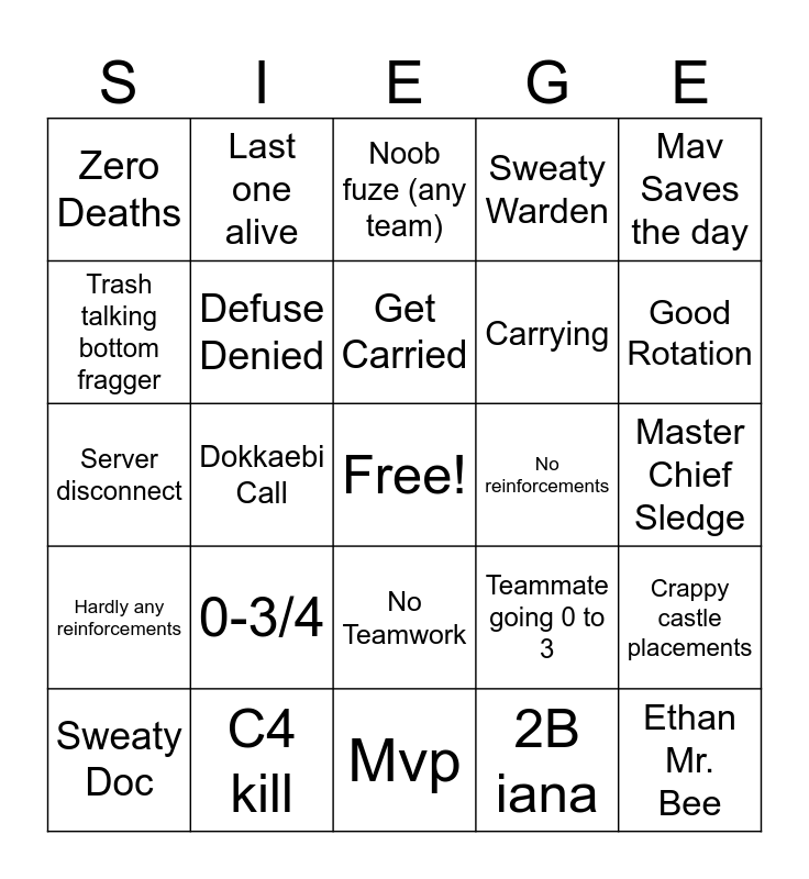 This bingo card has a free space and 27 words: Teammate going 0 to 3, Random tk, Carrying, Mvp, Trash talking bottom fragger, Noob fuze (any team), Last one alive, Hardly any reinforcements, No reinforcements, Crappy castle placements, Server disconnect, Sweaty Warden, Sweaty Doc, C4 kill, Good Rotation, Bomb defused, Defuse Denied, Get Carried, 0-3/4, Zero Deaths, Master Chief Sledge, 2B iana, Dokkaebi Call, Ethan Mr. Bee, No Teamwork, Mav Saves the day and Ace (5 kill).