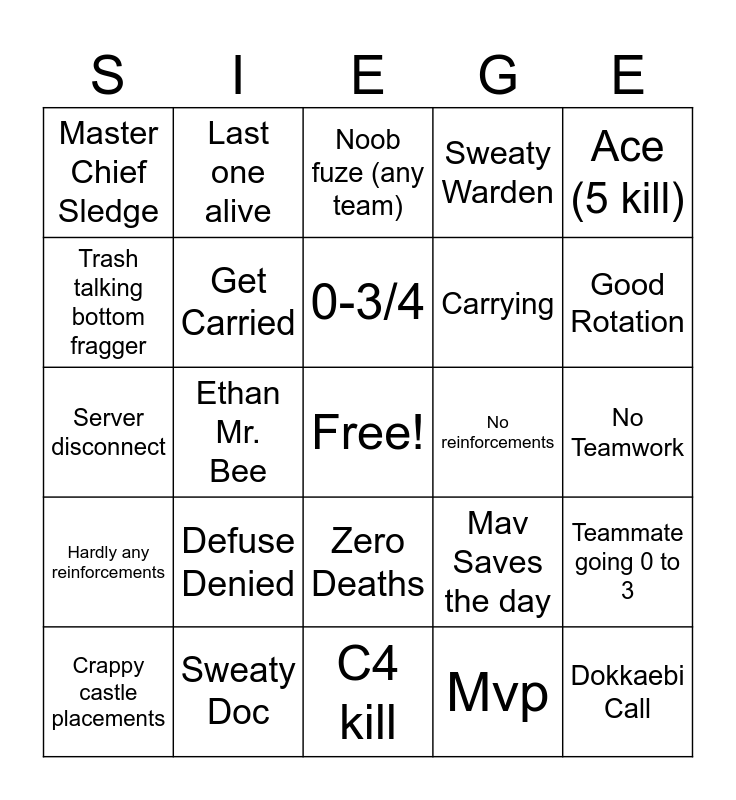 This bingo card has a free space and 28 words: Teammate going 0 to 3, Random tk, Carrying, Mvp, Trash talking bottom fragger, Noob fuze (any team), Last one alive, Hardly any reinforcements, No reinforcements, Crappy castle placements, Server disconnect, Sweaty Warden, Sweaty Doc, C4 kill, Good Rotation, Bomb defused, Defuse Denied, Get Carried, 0-3/4, Zero Deaths, Master Chief Sledge, 2B iana, Dokkaebi Call, Ethan Mr. Bee, No Teamwork, Mav Saves the day, Ace (5 kill) and Evenly fought.