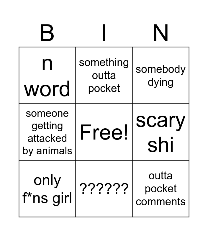This bingo card has a free space and 8 words: scary shi, somebody dying, something outta pocket, only f*ns girl, n word, outta pocket comments, someone getting attacked by animals and ??????.