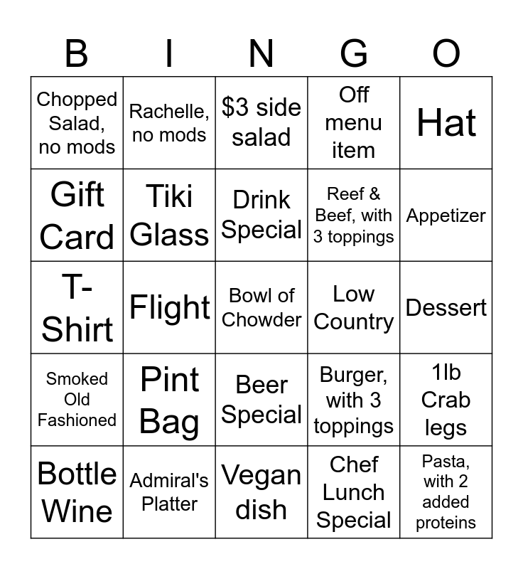 This bingo card has a free space and 24 words: Pint Bag, Admiral's Platter, Drink Special, Bottle Wine, Hat, Chopped Salad, no mods, Gift Card, Rachelle, no mods, Low Country, Beer Special, Reef & Beef, with 3 toppings, T-Shirt, Burger, with 3 toppings, 1lb Crab legs, Tiki Glass, Chef Lunch Special, Dessert, $3 side salad, Appetizer, Flight, Pasta, with 2 added proteins, Smoked Old Fashioned, Off menu item and Vegan dish.