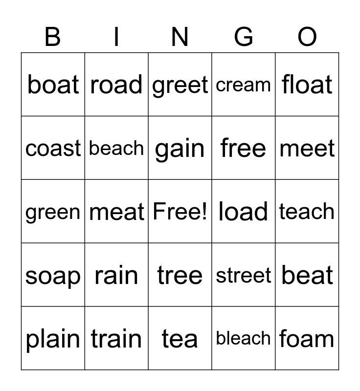 This bingo card has a free space and 24 words: rain, train, gain, plain, float, boat, coast, road, load, tree, free, green, street, beat, beach, bleach, teach, greet, meet, meat, foam, soap, cream and tea.