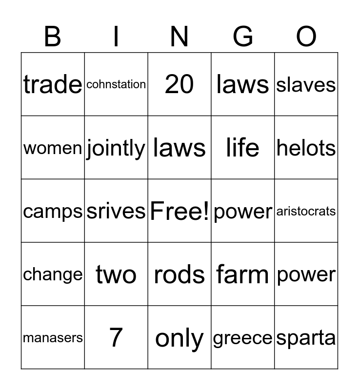 This bingo card has a free space and 24 words: two, 7, laws, manasers, slaves, trade, women, cohnstation, power, rods, life, camps, farm, power, jointly, greece, aristocrats, 20, helots, srives, sparta, change, laws and only.