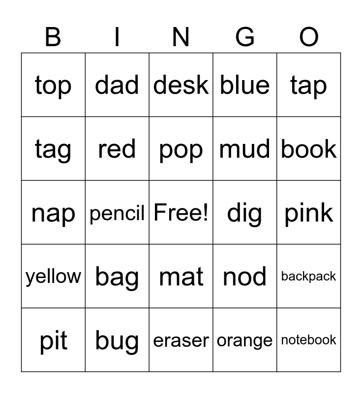 This bingo card has a free space and 24 words: bag, bug, pop, pit, tap, top, tag, dad, dig, mat, mud, nap, nod, backpack, red, orange, pink, desk, book, pencil, notebook, yellow, blue and eraser.
