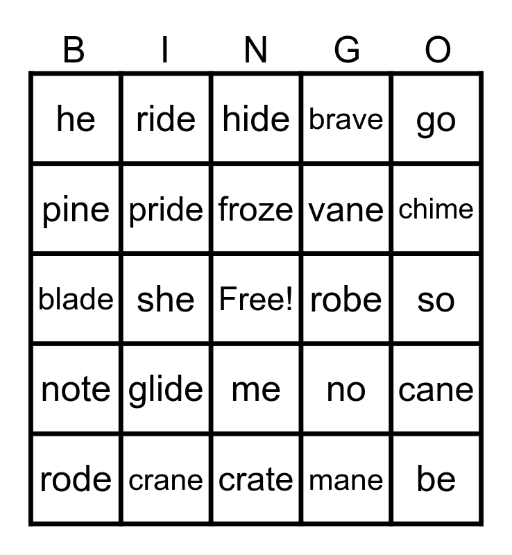This bingo card has a free space and 28 words: cane, cape, vane, mane, pine, hide, ride, note, robe, rode, blade, brave, crane, crate, chime, drive, glide, pride, froze, me, he, we, be, she, so, no, go and hi.