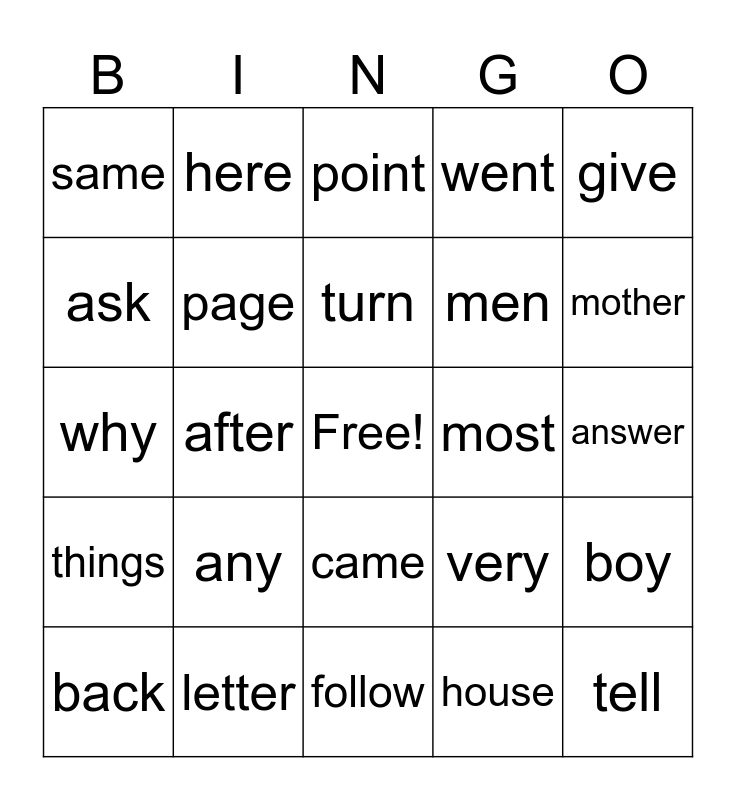 This bingo card has a free space and 24 words: back, any, turn, house, give, same, here, point, most, answer, why, page, very, boy, ask, letter, follow, went, mother, things, after, came, men and tell.