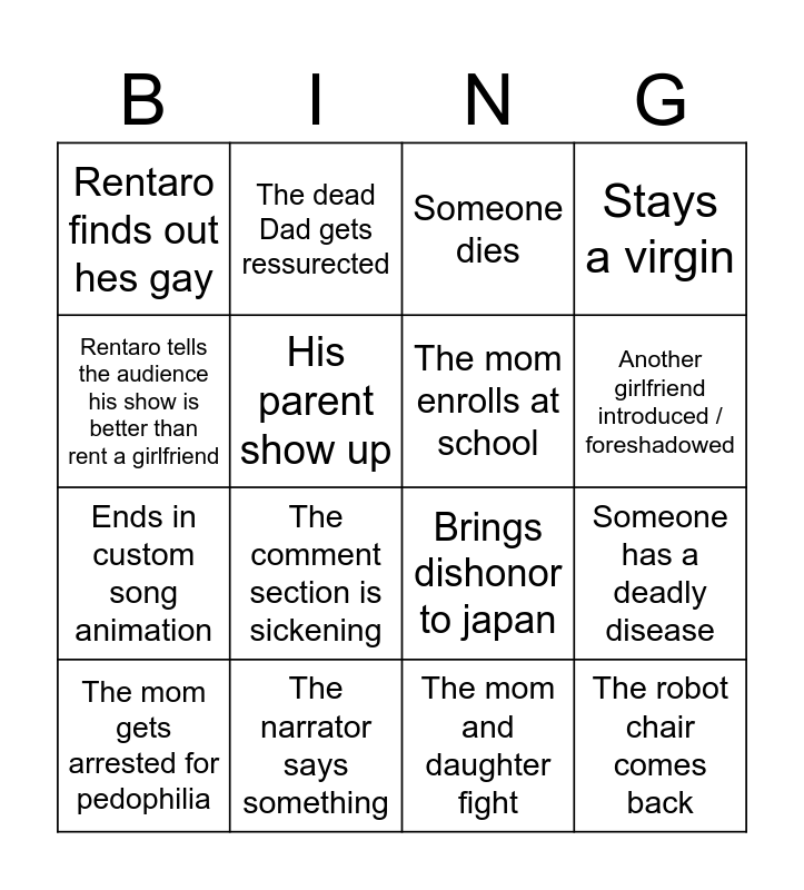 This bingo card has 16 words: The mom gets arrested for pedophilia, The narrator says something, Someone dies, Stays a virgin, Rentaro tells the audience his show is better than rent a girlfriend, The dead Dad gets ressurected, Brings dishonor to japan, Someone has a deadly disease, Rentaro finds out hes gay, His parent show up, The mom and daughter fight, Another girlfriend introduced / foreshadowed, Ends in custom song animation, The comment section is sickening, The mom enrolls at school and The robot chair comes back.