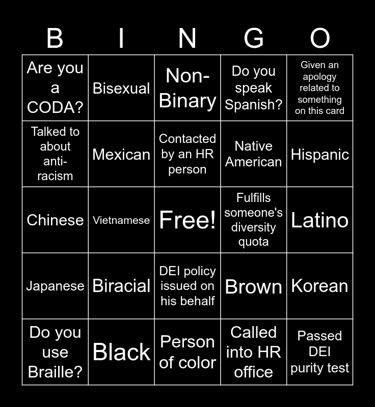 This bingo card has a free space and 24 words: Biracial, Black, Contacted by an HR person, Do you use Braille?, Given an apology related to something on this card, Are you a CODA?, Talked to about anti-racism, Bisexual, Fulfills someone's diversity quota, DEI policy issued on his behalf, Native American, Chinese, Brown, Korean, Mexican, Called into HR office, Latino, Non-Binary, Hispanic, Vietnamese, Passed DEI purity test, Japanese, Do you speak Spanish? and Person of color.