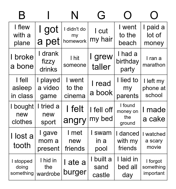 This bingo card has 36 words: I swam in a pool, I met new friends, I built a sand castle, I broke a bone, I bought new clothes, I read a book, I drank fizzy drinks, I ate a burger, I went to the beach, I danced with my friends, I ran a marathon, I cut my hair, I watched a scary movie, I played a video game, I grew taller, I flew with a plane, I lost a tooth, I lied to my parents, I fell asleep in class, I didn't do my homework, I went to the cinema, I tried a new sport, I fell off my bed, I felt angry, I found money on the ground, I got a pet, I had a birthday party, I hid in the wardrobe, I hit someone, I paid a lot of money, I forgot something important, I stopped doing something, I made a cake, I left my phone at school, I gave mom a present and I laid in bed all day.