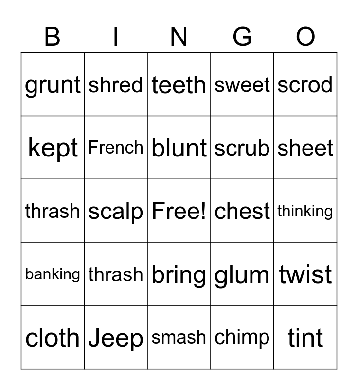 This bingo card has a free space and 52 words: shrug, tint, trust, smash, thrash, plump, shred, finch, kept, crept, French, swift, twist, glum, grasp, frisk, blunt, chest, slant, scrod, scalp, chimp, grunt, scrub, free, seem, feet, peek, sheet, scree, sweep, sweet, deep, cheep, queen, teeth, Jeep, meeting, seeping, bang, sinking, thinking, banking, thank, bring, sung, prong, thrash, thump, ringing, cloth and stink.