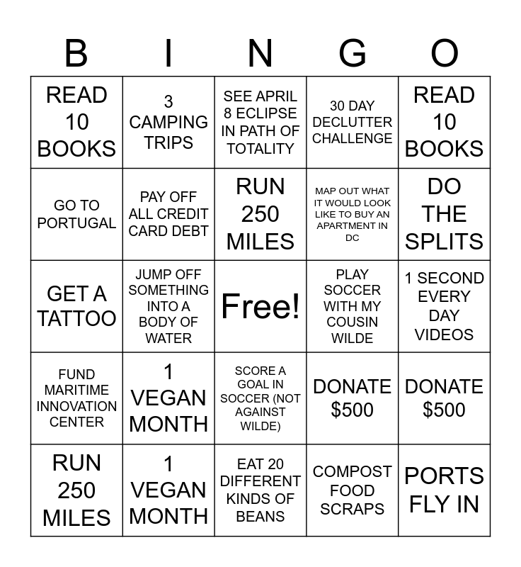 This bingo card has a free space and 24 words: 1 VEGAN MONTH, 1 VEGAN MONTH, RUN 250 MILES, RUN 250 MILES, READ 10 BOOKS, READ 10 BOOKS, GO TO PORTUGAL, 3 CAMPING TRIPS, PLAY SOCCER WITH MY COUSIN WILDE, SCORE A GOAL IN SOCCER (NOT AGAINST WILDE), MAP OUT WHAT IT WOULD LOOK LIKE TO BUY AN APARTMENT IN DC, GET A TATTOO, DONATE $500, DONATE $500, PAY OFF ALL CREDIT CARD DEBT, COMPOST FOOD SCRAPS, 1 SECOND EVERY DAY VIDEOS, SEE APRIL 8 ECLIPSE IN PATH OF TOTALITY, DO THE SPLITS, JUMP OFF SOMETHING INTO A BODY OF WATER, PORTS FLY IN, FUND MARITIME INNOVATION CENTER, 30 DAY DECLUTTER CHALLENGE and EAT 20 DIFFERENT KINDS OF BEANS.
