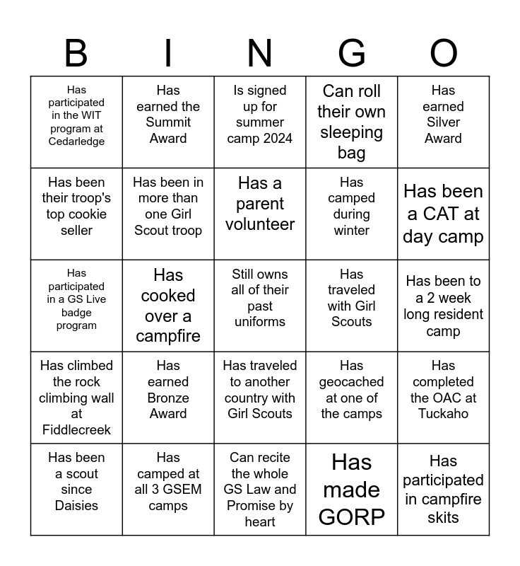 This bingo card has a free space and 24 words: Has earned Bronze Award, Has camped at all 3 GSEM camps, Has a parent volunteer, Has been a scout since Daisies, Has earned Silver Award, Has participated in the WIT program at Cedarledge, Has been their troop's top cookie seller, Has earned the Summit Award, Has traveled with Girl Scouts, Has traveled to another country with Girl Scouts, Has camped during winter, Has participated in a GS Live badge program, Has geocached at one of the camps, Has completed the OAC at Tuckaho, Has been in more than one Girl Scout troop, Has made GORP, Has been to a 2 week long resident camp, Is signed up for summer camp 2024, Has been a CAT at day camp, Has cooked over a campfire, Has participated in campfire skits, Has climbed the rock climbing wall at Fiddlecreek, Can roll their own sleeping bag and Can recite the whole GS Law and Promise by heart.