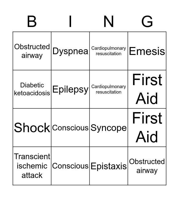 This bingo card has 16 words: Conscious, First Aid, Cardiopulmonary resuscitation, Obstructed airway, Shock, Dyspnea, Syncope, Epistaxis, Diabetic ketoacidosis, Epilepsy, Transcient ischemic attack, Emesis, Conscious, First Aid, Cardiopulmonary resuscitation and Obstructed airway.