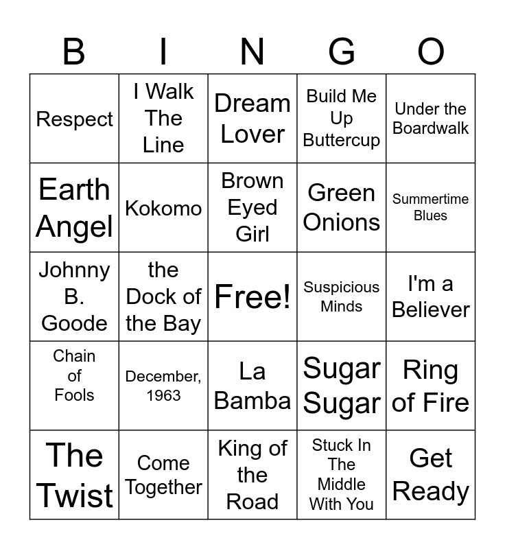 This bingo card has a free space and 29 words: The Twist, Bye Bye Love, the Dock of the Bay, My Girl, Respect, Dream Lover, Kokomo, December, 1963, Suspicious Minds, Come Together, I'm a Believer, Get Ready, King of the Road, Stuck In The Middle With You, Summertime Blues, Good Vibrations, La Bamba, Chain of Fools, Under the Boardwalk, Johnny B. Goode, Sugar Sugar, Beyond the Sea, Green Onions, Earth Angel, Build Me Up Buttercup, I Walk The Line, Ring of Fire, Brown Eyed Girl and Chapel of Love.