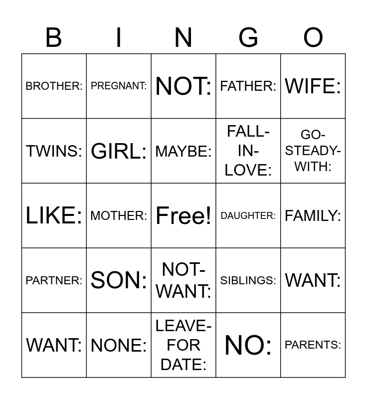 This bingo card has a free space and 39 words: BOYFRIEND:, GIRLFRIEND:, BOY:, GIRL:, WANT:, NOT-WANT:, MAYBE:, HUSBAND:, WIFE:, PARTNER:, MOTHER:, FATHER:, PARENTS:, FAMILY:, DAUGHTER:, SON:, CHILDREN:, BROTHER:, SISTER:, SIBLINGS:, TWINS:, LEAVE-FOR DATE:, FALL-IN-LOVE:, GO-STEADY-WITH:, OFFER MARRIAGE:, ENGAGED:, MARRY:, WEDDING:, CONCEIVE:, PREGNANT:, GIVE-BIRTH-TO:, IN-FUTURE:, NOT:, NONE:, NO:, HAVE:, WANT:, LIKE: and NEED:.