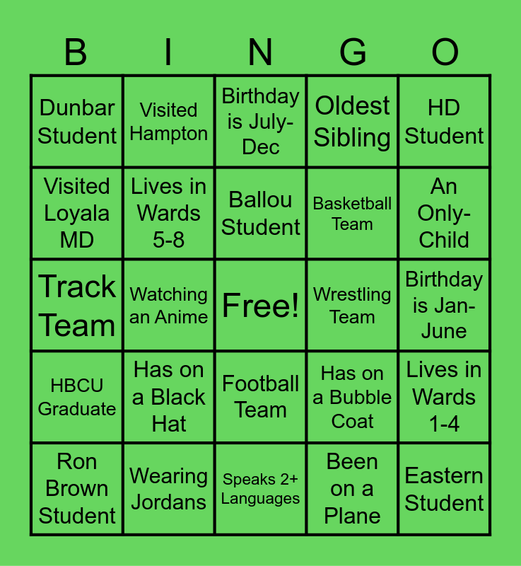 This bingo card has a free space and 24 words: Has on a Black Hat, Wearing Jordans, Ballou Student, Ron Brown Student, HD Student, Dunbar Student, Visited Loyala MD, Visited Hampton, Wrestling Team, Football Team, Basketball Team, Track Team, Has on a Bubble Coat, Lives in Wards 1-4, Lives in Wards 5-8, Been on a Plane, Birthday is Jan-June, Birthday is July-Dec, An Only-Child, Watching an Anime, Eastern Student, HBCU Graduate, Oldest Sibling and Speaks 2+ Languages.