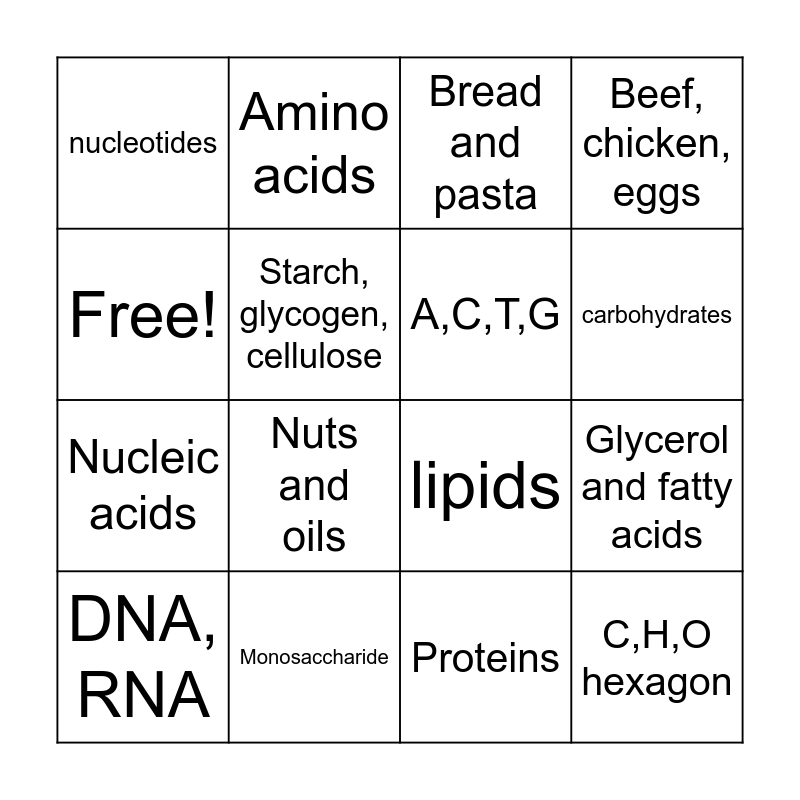 This bingo card has 16 words: Monosaccharide, Glycerol and fatty acids, Bread and pasta, nucleotides, Nucleic acids, Amino acids, lipids, Proteins, Free!, Starch, glycogen, cellulose, DNA, RNA, Beef, chicken, eggs, Nuts and oils, carbohydrates, A,C,T,G and C,H,O hexagon.