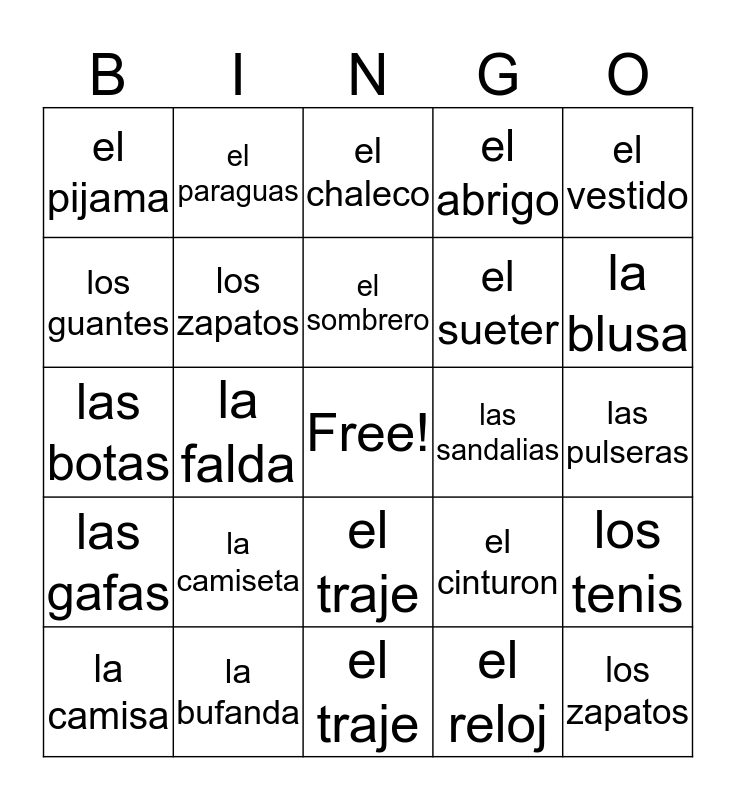 This bingo card has a free space and 24 words: la camiseta, la bufanda, el sombrero, la camisa, el vestido, el pijama, los guantes, el paraguas, las sandalias, el traje, el sueter, las botas, el cinturon, los tenis, los zapatos, el reloj, las pulseras, el chaleco, la blusa, la falda, los zapatos, las gafas, el abrigo and el traje.