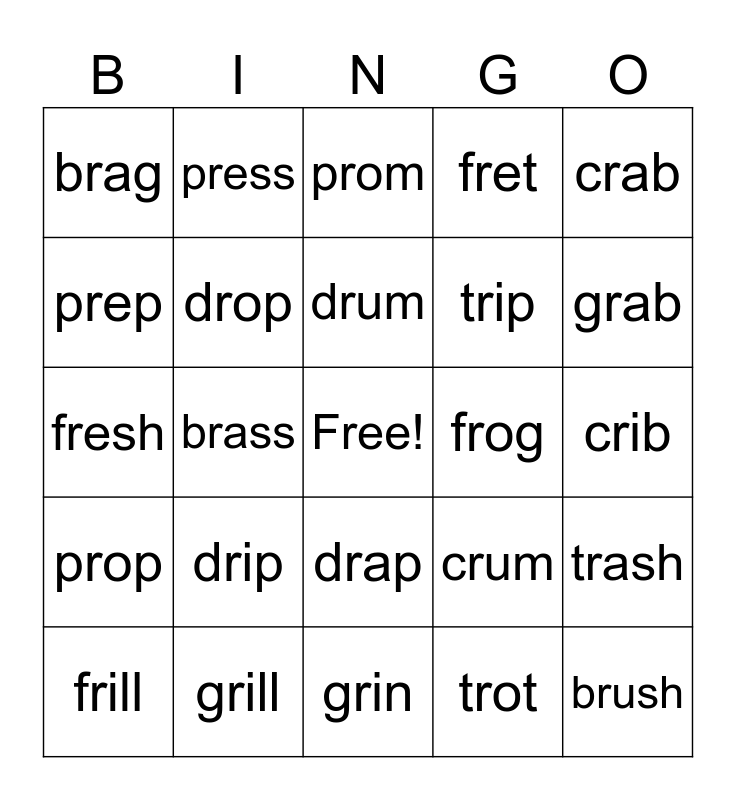 This bingo card has a free space and 28 words: trash, trap, trip, trot, prep, prom, press, prop, frog, frill, fresh, fret, grill, grin, grab, grub, drip, drop, drum, drap, brag, brat, brush, brass, crib, crum, crab and crop.