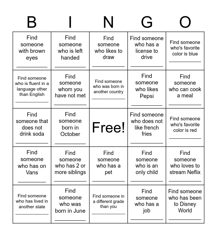 This bingo card has a free space and 24 words: Find someone who has 2 or more siblings ___________, Find someone who was born in June __________, Find someone who was born in another country ______________, Find someone who has lived in another state _____________, Find someone who's favorite color is blue ____________, Find someone with brown eyes __________, Find someone who is fluent in a language other than English _____________, Find someone who is left handed __________, Find someone who does not like french fries ___________, Find someone who has a pet ___________, Find someone who likes Pepsi __________, Find someone that does not drink soda ___________, Find someone who is an only child ___________, Find someone who loves to stream Neflix ___________, Find someone whom you have not met ___________, Find someone who has a job ___________, Find someone who's favorite color is red ____________, Find someone who likes to draw ___________, Find someone who can cook a meal ___________, Find someone born in October __________, Find someone who has been to Disney World ___________, Find someone who has on Vans _________, Find someone who has a license to drive ___________ and Find someone in a different grade than you ______________.