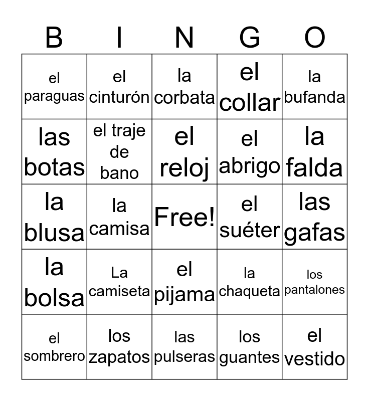 This bingo card has a free space and 24 words: La camiseta, los zapatos, el reloj, el sombrero, la bufanda, el paraguas, las botas, el cinturón, el suéter, el pijama, el abrigo, la blusa, la chaqueta, los pantalones, el traje de bano, los guantes, las gafas, la corbata, la falda, la camisa, el vestido, la bolsa, el collar and las pulseras.