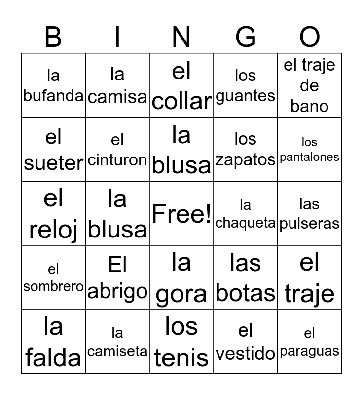 This bingo card has a free space and 24 words: El abrigo, la camiseta, la blusa, la falda, el traje de bano, la bufanda, el sueter, la camisa, la chaqueta, la gora, los zapatos, el reloj, las botas, el traje, el cinturon, el vestido, las pulseras, el collar, los pantalones, la blusa, el paraguas, el sombrero, los guantes and los tenis.