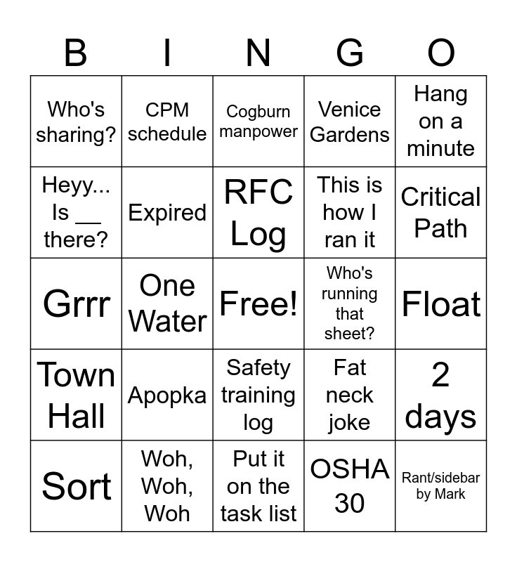 This bingo card has a free space and 24 words: Apopka, Woh, Woh, Woh, RFC Log, Sort, Hang on a minute, Who's sharing?, Heyy... Is __ there?, CPM schedule, Who's running that sheet?, Safety training log, This is how I ran it, Grrr, Fat neck joke, 2 days, Expired, OSHA 30, Float, Cogburn manpower, Critical Path, One Water, Rant/sidebar by Mark, Town Hall, Venice Gardens and Put it on the task list.