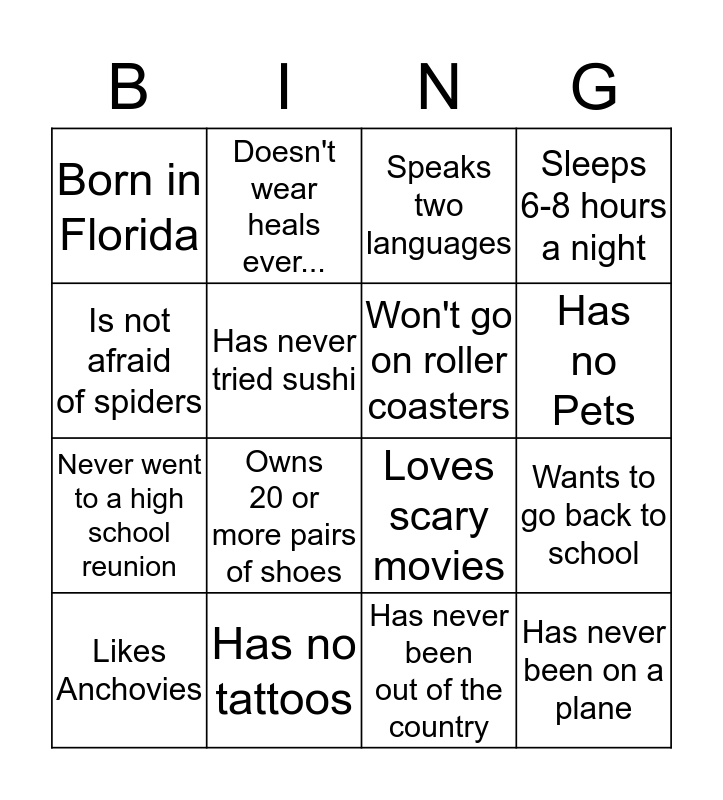 This bingo card has a free space and 15 words: Likes Anchovies, Has never been on a plane, Speaks two languages, Born in Florida, Has no Pets, Is not afraid of spiders, Owns 20 or more pairs of shoes, Has never been out of the country, Has never tried sushi, Never went to a high school reunion, Wants to go back to school, Sleeps 6-8 hours a night, Won't go on roller coasters, Doesn't wear heals ever... and Has no tattoos.