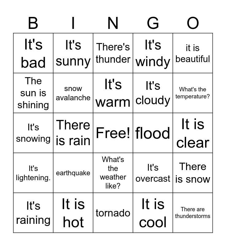 This bingo card has a free space and 26 words: What's the weather like?, It is cool, It's warm, It is hot, it is beautiful, It's bad, The sun is shining, It's sunny, It is clear, It's overcast, It's cloudy, It's snowing, There is snow, It's raining, There is rain, It is foggy, It's windy, It's lightening., There's thunder, There are thunderstorms, What's the temperature?, tornado, flood, earthquake, snow avalanche and volcanic eruption.