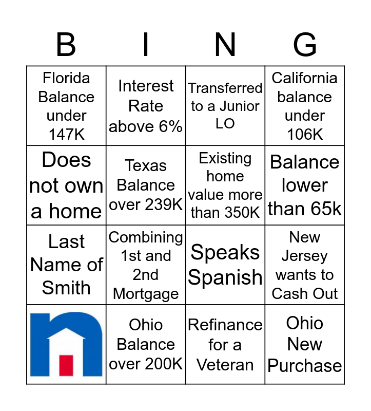This bingo card has 1 images and 15 words: Ohio Balance over 200K, New Jersey wants to Cash Out, Transferred to a Junior LO, Florida Balance under 147K, Last Name of Smith, Interest Rate above 6%, Speaks Spanish, Refinance for a Veteran, Does not own a home, Texas Balance over 239K, California balance under 106K, Combining 1st and 2nd Mortgage, Balance lower than 65k, Existing home value more than 350K and Ohio New Purchase.