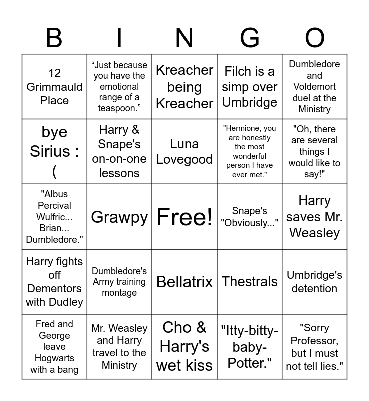 This bingo card has a free space and 24 words: Dumbledore's Army training montage, Mr. Weasley and Harry travel to the Ministry, Luna Lovegood, Fred and George leave Hogwarts with a bang, Dumbledore and Voldemort duel at the Ministry, 12 Grimmauld Place, bye Sirius :(, “Just because you have the emotional range of a teaspoon.”, Snape's "Obviously...", Bellatrix, "Hermione, you are honestly the most wonderful person I have ever met.", "Albus Percival Wulfric... Brian... Dumbledore.", Thestrals, Umbridge's detention, Harry & Snape's on-on-one lessons, "Itty-bitty-baby-Potter.", Harry saves Mr. Weasley, Kreacher being Kreacher, "Oh, there are several things I would like to say!", Grawpy, "Sorry Professor, but I must not tell lies.", Harry fights off Dementors with Dudley, Filch is a simp over Umbridge and Cho & Harry's wet kiss.